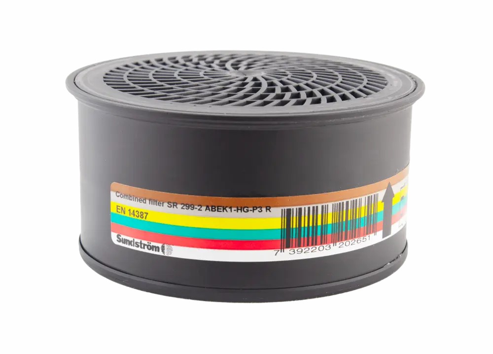 SR 299-2过滤器是集合了1级气体过滤和3级颗粒过滤器的组合过滤器,适用于桑德斯托姆的各种半面型和全面型面具。此过滤器是 ABEK1-Hg-P3R型·可以防护以下气体、蒸气和颗粒物。A类有机气体和蒸汽,如沸点在65℃以上的溶剂。B类无机气体和蒸汽·如氯气,硫化氢和氰化氢。E类酸性气体和蒸气,如二氧化硫和氟化氢。氨气和某些胺类气体,比如乙烯二胺。Hg类汞蒸气。注意最长使用时间为50小时。P3R*类可防止所有类型的颗粒污染物,例如灰尘·雾和烟。